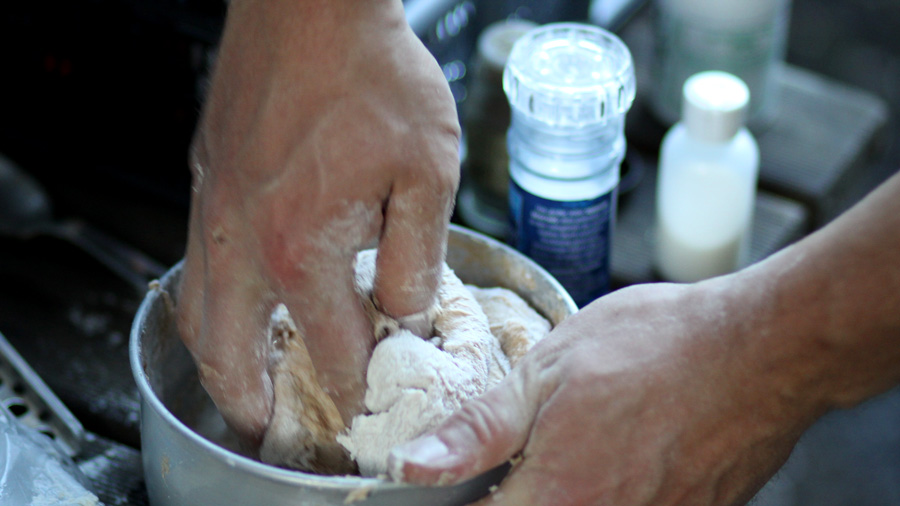 Brotbacken ohne Backofen. Als nächstes das Bannock-Brot ohne Backofen. Aus Mehl, Wasser, Zucker, Salz und Trockenhefe kneten wir uns einen Teig, den wir einige Zeit im warmen Topf gehen lassen. Und anschließend, es ist überraschend leicht, „backen“ wir das Bannock-Brot im geschlossenen Topf am Rand des Lagerfeuers. Nach etwa 20 bis 30 Minuten ist es fertig: sensationell lecker, zweiter Teil! Und das Bannock ist auch am nächsten Morgen immer noch ein Genuss. (Wer es nachmachen will: Abenteurer Walter Steinberg hat das Rezept).